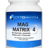 When it comes to bioavailability, magnesium bis-glycinate offers advantages. Magnesium bis-glycinate is a form of magnesium that combines one magnesium molecule with two molecules of glycine, an inhibitory amino acid. This chelated bond is advantageous because it remains stable throughout the digestive tract, preventing magnesium from binding to other compounds. The presence of glycine also allows the molecule to access dipeptide transport sites. Ultimately, this results in better absorption and tolerability. Cyto-Matrix Mag Matrix 4 combines these four forms of magnesium to deliver the synergistic benefits of magnesium without compromise. Each capsule provides 100 mg of elemental magnesium in a well-absorbed and well-tolerated blend. 120 vegetarian capsules per bottle.