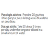 Adultes : 20 gouttes 3 fois par jour, sous la langue ou diluées dans un peu d'eau.