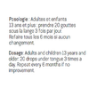 Adultes : 20 gouttes sous la langue 3 fois par jour pendant 33 jours. Répéter tous les 6 mois si les symptômes restent les mêmes. Prendre tel quel ou diluer dans une cuillère à café d'eau. Garder sous la langue pendant 1 minute.