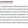 Ingrédients : Aqua, Glycérine, Propylène Glycol, Caféine (et) Salicylate de sodium (et) Lécithine (et) Silice, Diazolidinyl Urea (et) Iodopropynyl Butylcarbamate, Acrylates/C10-30 Alkyl Acrylate Crosspolymer, Dextran (et) Caprooyl-Tetrapeptide-3, Extrait de feuille de lierre (Hedera Helix), extrait de fleur de calendula officinalis, extrait de feuille de centella asiatica, extrait de fucus vesiculosus, extrait d'hypericum perforatum, hyaluronate de sodium, hydroxyde de sodium.
