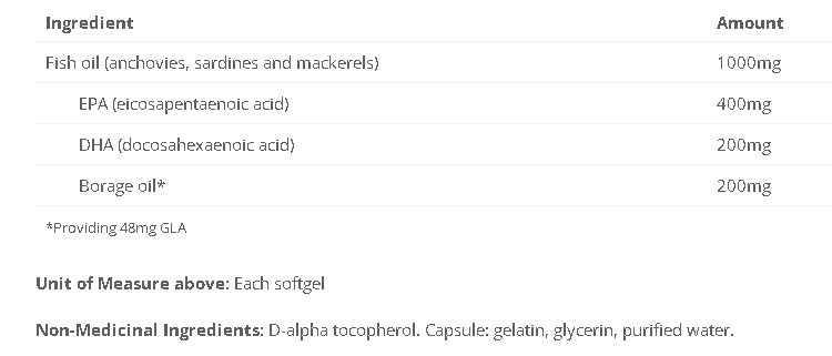 Ingrédient (par gélule):Huile de poisson (anchois, sardines et maquereaux) 1000mgEPA (acide eicosapentaénoïque) 400 mgDHA (acide docosahexaénoïque) 200 mgHuile de bourrache 200 mg Ingrédients non médicinaux : D-alpha tocophérol. Gélule : gélatine, glycérine, eau purifiée.